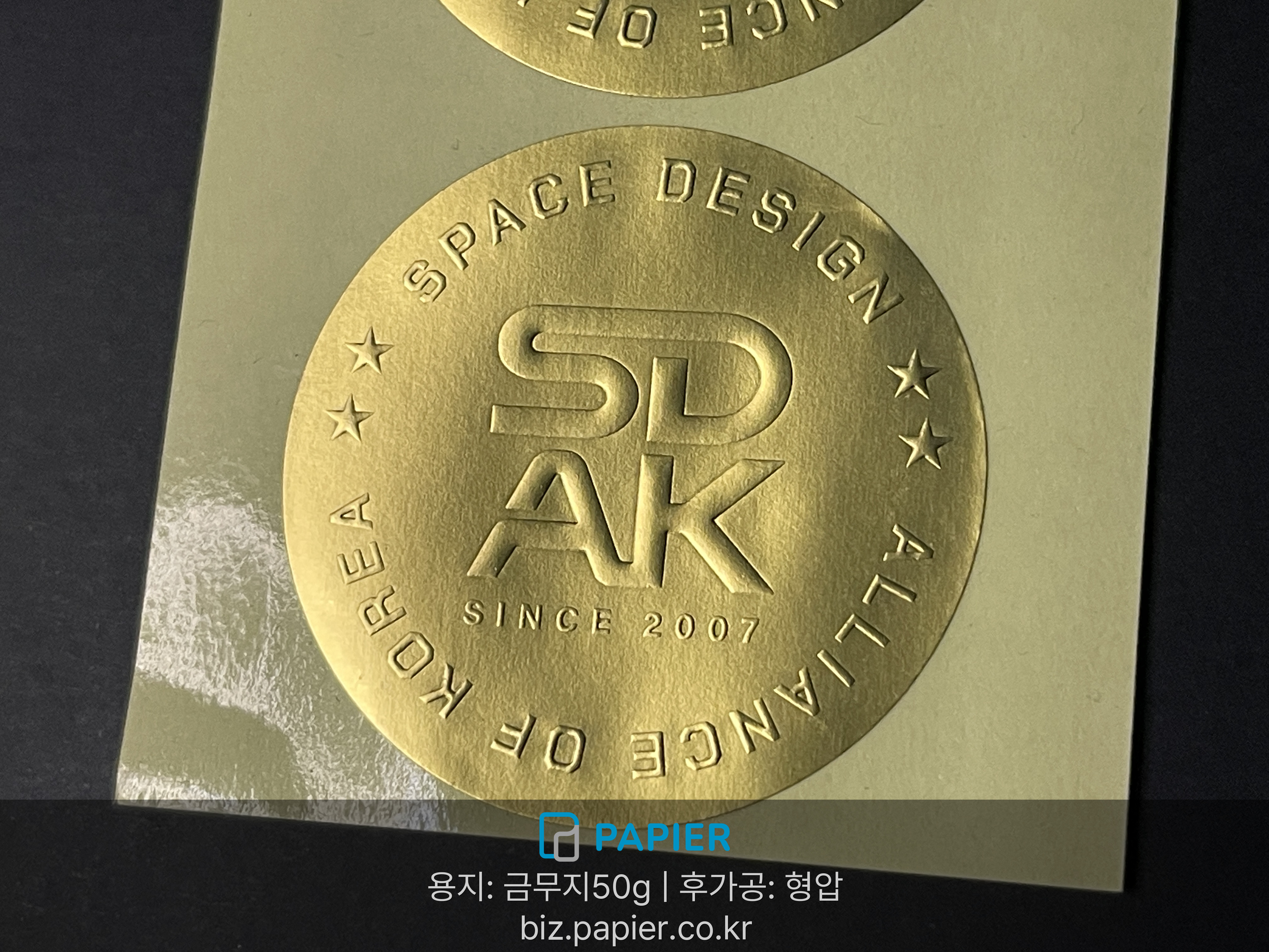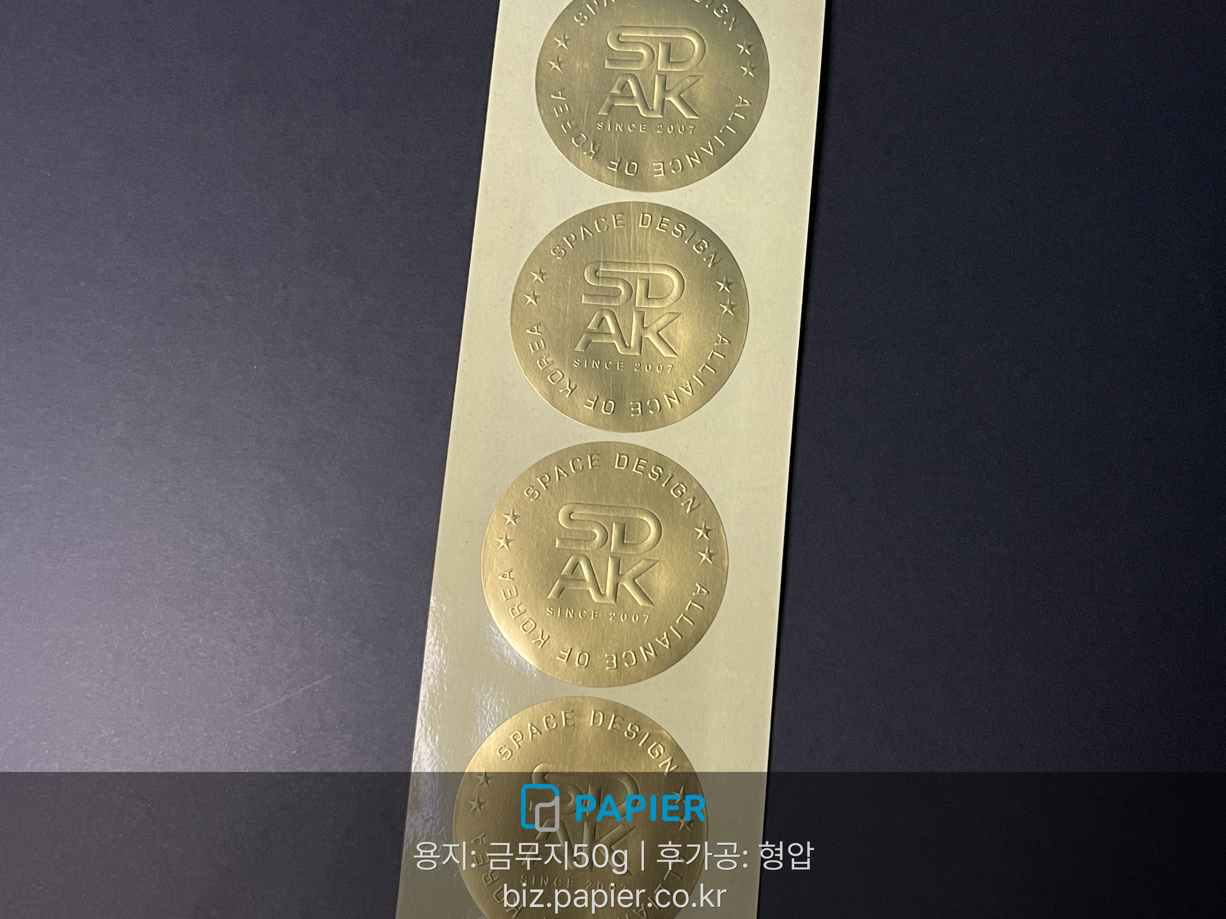금무지 50g 용지 형압 후가공 로고 스티커 제작 사례